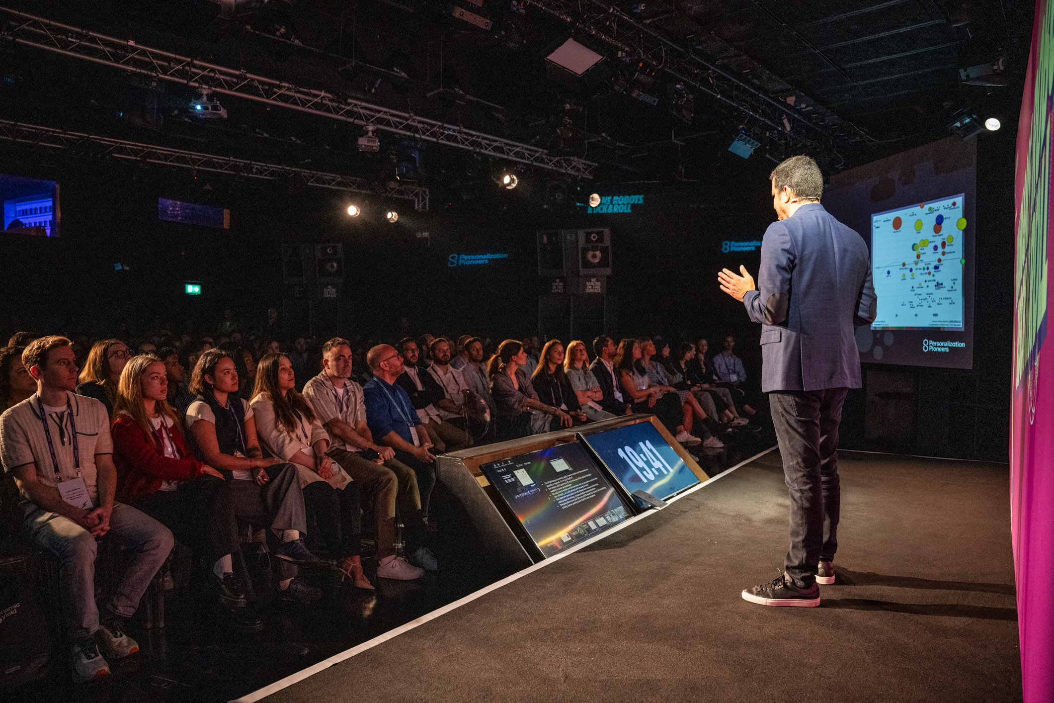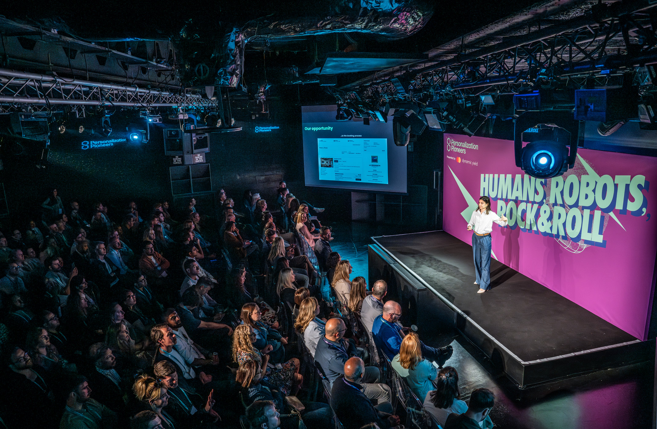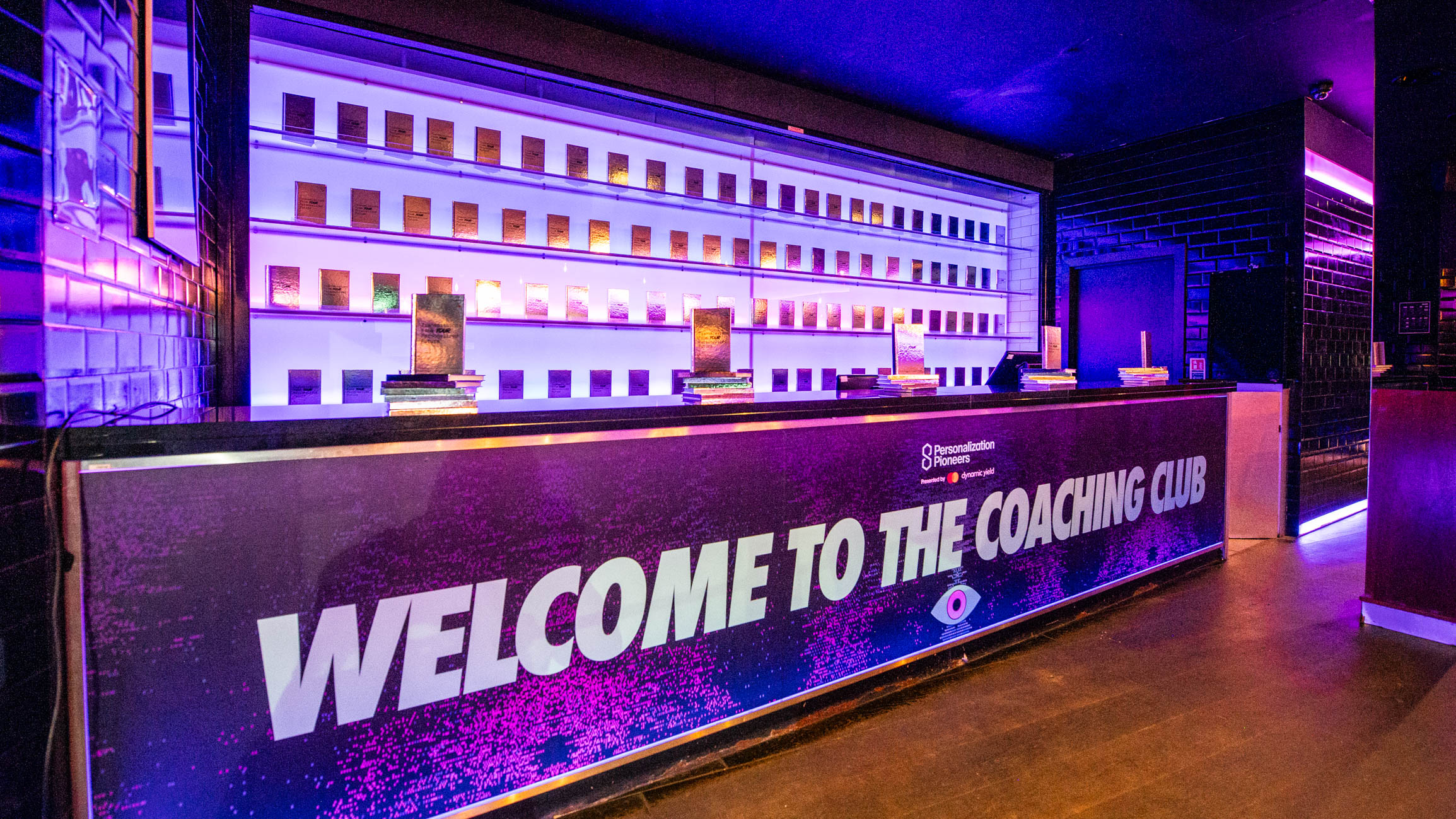 The Box acted as the central conference space, set in a theatre layout with a fully branded stage backdrop. Dynamic Yield made strong use of the venue’s AV capabilities, carrying their brand colours across screens and lighting to create a cohesive visual identity during the conference sessions.