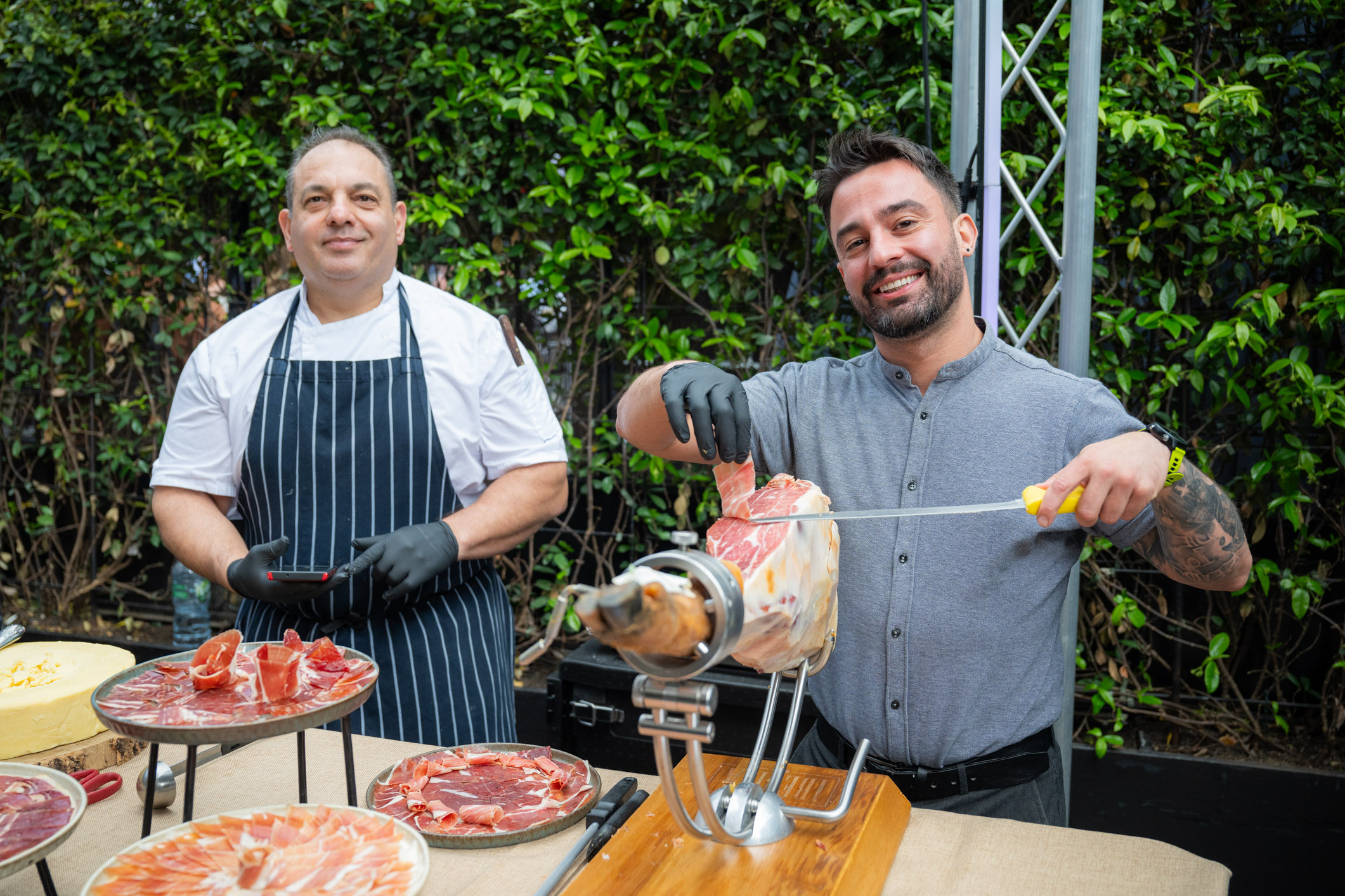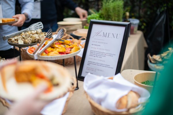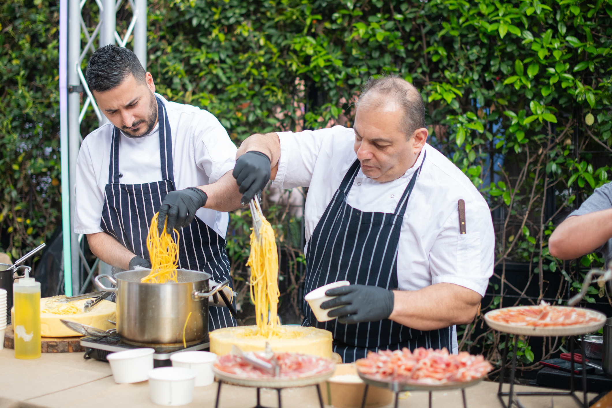 Outside, the courtyard became a hub for food, drinks, and interactive activations. Gourmet catering included freshly sliced Serrano ham, roasted chicken cooked on a barbecue, and pasta served from a cheese wheel. A DJ accompanied the space throughout the day, contributing to the atmosphere as guests moved between sessions.